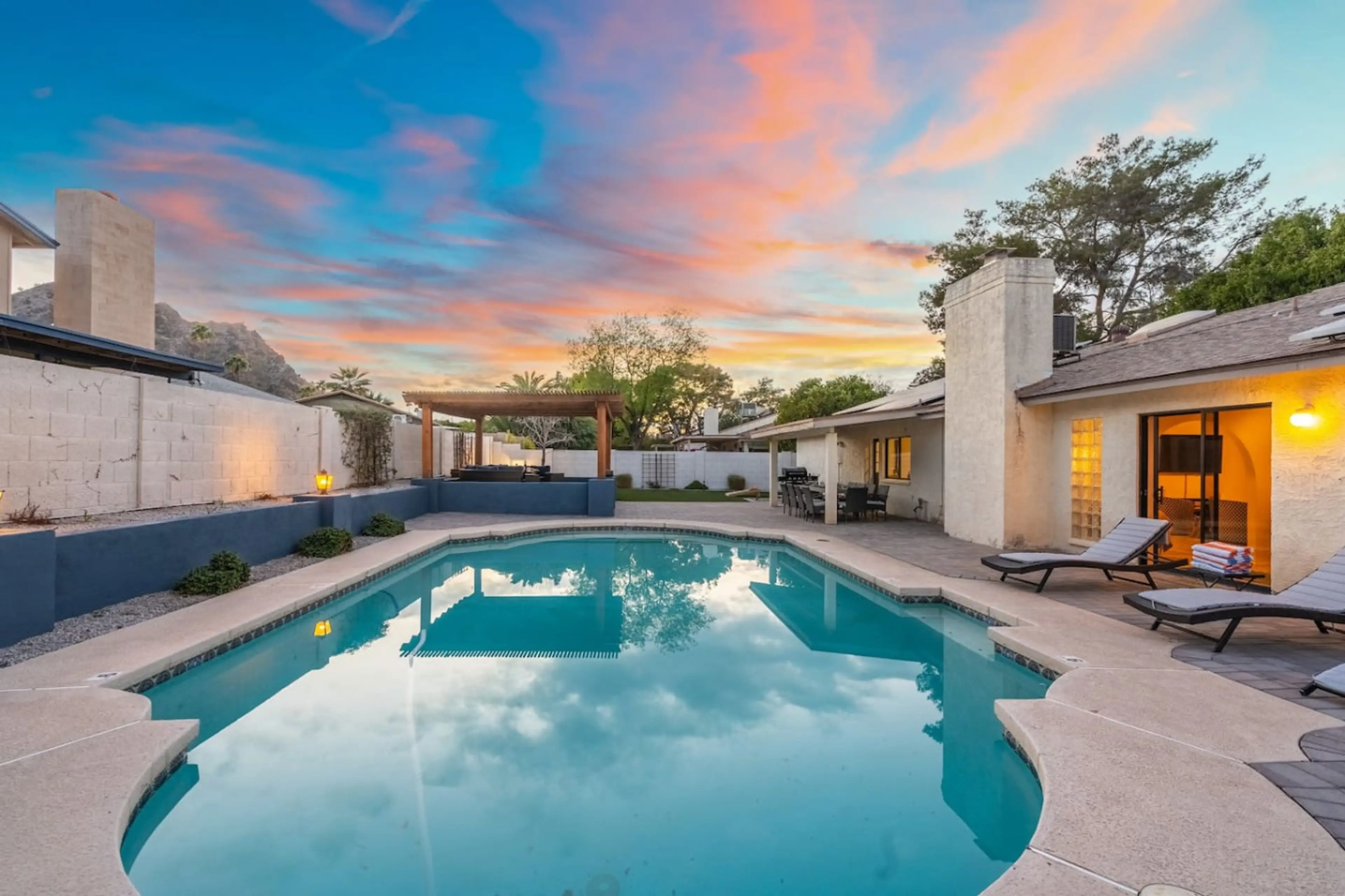 Welcome to The Sunnyside of Life Retreat! This spacious 5BR/3BA home features a large heated pool, mountain views, and a backyard oasis with a fire pit lounge under a gazebo, grassy play area, and space to unwind. Inside, you’ll find games for both kids and adults, comfy furnishings, and stylish dec...